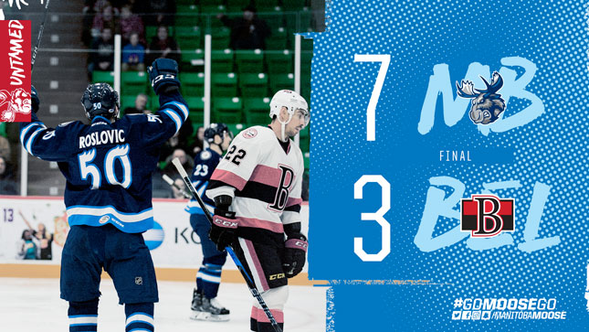 Belleville seemed to have the momentum heading to the third period, but the Moose turned things around on the Senators in a hurry. Patrice Cormier put the Moose back in front 2:54 into the third, cashing in a rebound at the top of the crease and the charge was just getting started. With the Moose on the power play, Sami Niku snuck down from the point and popped in an Appleton pass from the back door to make it 5-3 at 5:45. Cormier struck for his second at 7:06 of the period, tipping in a Charles-David Beaudoin point shot. Cameron Schilling capped off the run 10 minutes into the period with a slick finish after being set up by Robinson on a two-on-one. The Moose cruised from there, picking up the 7-3 victory, their fourth straight on the road.