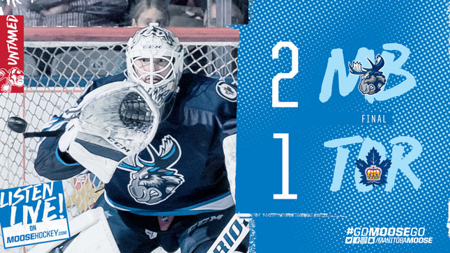 The final frame was more of the same from the net minders. Sparks stopped a two-on-one chance from JC Lipon, and a breakaway from Mason Appleton in quick succession, while Hutchinson frustrated the Marlies and their fans, who were waiting for a goal to cue their Teddy Bear Toss. After killing a few late penalties, the Moose extended their lead thanks to hard work from Mason Appleton giving way to an empty net goal for captain Patrice Cormier (12). With just 21 seconds left and the net empty, Jeremy Bracco finally solved Hutchinson ending his shutout bid, but the Moose held on for the 2-1 victory.