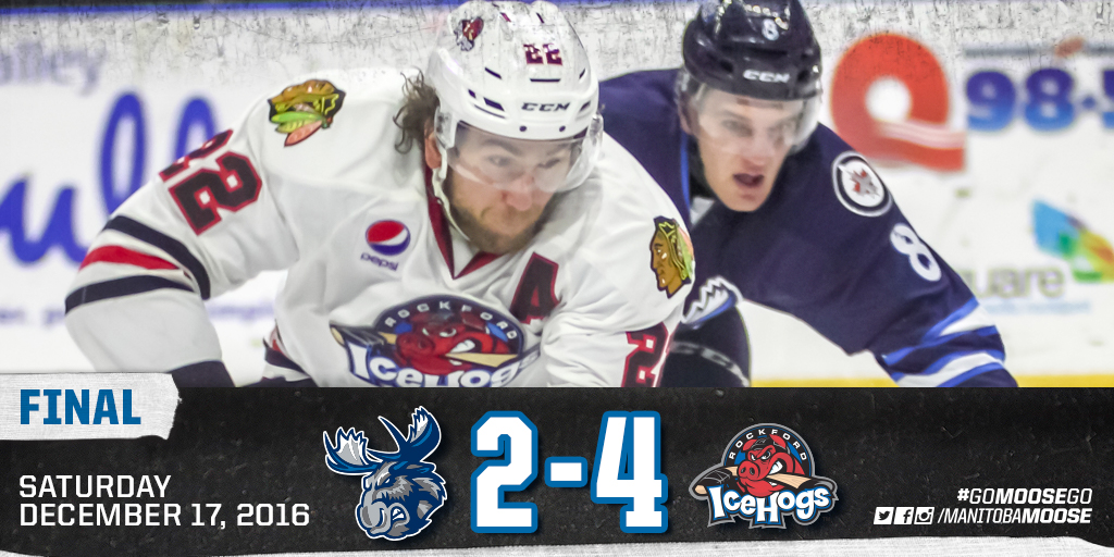 The third period started well for the Manitoba Moose after they were able to get solid pressure on Rockford’s penalty kill. However, the IceHogs were the ones to take advantage. Nick Schmaltz pounced on a Manitoba turnover and fired it past Pavelec for a shorthanded tally 5:47 into the final frame. For the second time in the game, the IceHogs scored another set of quick back-to-back goals when Mark McNeill finished off a tick-tack-toe, vaulting the home side to a 4-1 lead. The Moose were able to put one past IceHogs ‘tender Mac Carruth in the third when Brendan Lemieux redirected a Peter Stoykewych point blast at 17:33 to cut into Rockford’s lead. Lemieux’s goal was all the Moose could muster down the stretch as Rockford picked up a 4-2 victory.