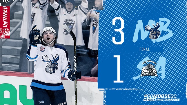 Play balanced out in the third frame, but it was still a busy one for both goaltenders. Hutchinson made 11 stops for the Moose while Spencer Martin made 12 to keep the Rampage in striking distance. San Antonio had a glorious chance to tie the game late on a shorthanded breakaway, but Hutchinson got a piece of the puck. Heading back the other way, Mason Appleton scored into an empty net with 23 seconds left to seal the game at a 3-1 score. The Moose have won six games in a row and have points in 16 straight contests as the club hits the holiday break.