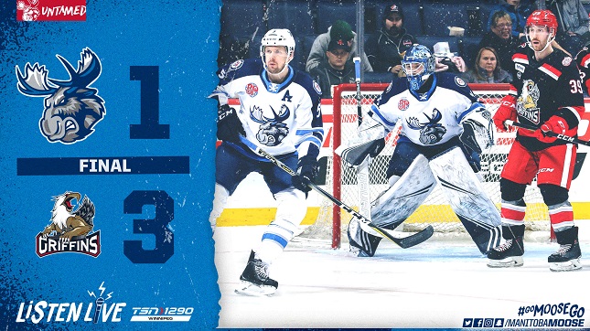 Manitoba ran into penalty trouble, taking three consecutive penalties in the first six minutes of the third period. The Griffins made the Moose pay as Axel Holmstrom pounced on a Brian Lashoff rebound to give the visitors a 3-0 lead. The Moose got back in the game with five minutes left courtesy of Peter Stoykewych, who buried a wrister after accepting a Sami Niku pass from the half-wall. Manitoba put the pressure on from there, but was unable to draw any closer as Grand Rapids claimed the 3-1 victory.