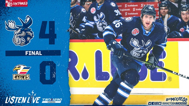 The Manitoba Moose (12-16-2-0) picked up a 4-0 victory in their first-ever meeting with the Colorado Eagles (15-11-3-1). The Moose got out of the gate quickly, opening the scoring just 37 seconds into the contest. Skyler McKenzie kept the puck on a two-on-one and guided it past Spencer Martin for his fourth of the season. McKenzie's tally was the only goal of the frame as Martin stopped the next 13 shots he faced, and Eric Comrie made 10 saves in the Moose net. Manitoba took a 1-0 lead to the break.