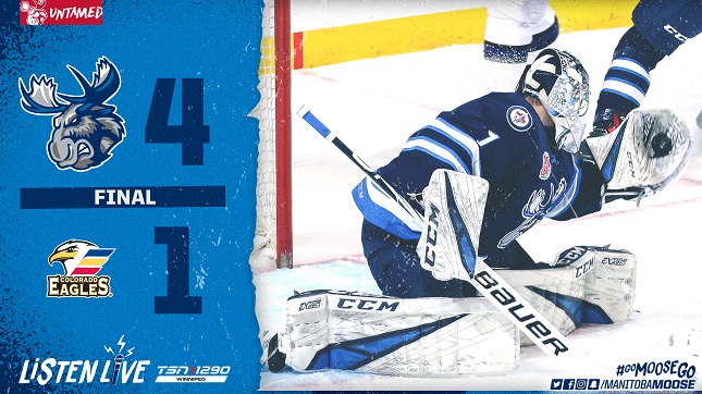 The Moose penalty kill came up with a pair of key stops in the opening five minutes of the final frame, turning aside back-to-back Eagles power plays. Comrie put the wall back up in the period, making 10 saves to keep the Moose lead at two goals. Lipon tacked on a final tally into an empty net to give Manitoba the 4-1 victory.