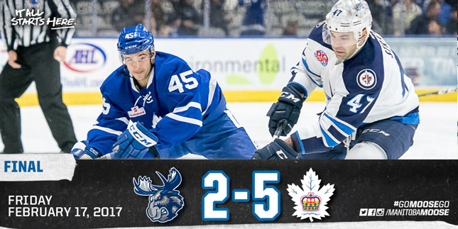 The Manitoba Moose (19-25-3-3) entered the final series of their six-game road trip, taking on the Toronto Marlies (25-22-3-1) at Ricoh Coliseum on Friday night. The Toronto powerplay looked sharp in the first period, striking twice for the Marlies. The first tally came 5:57 into the game when Dmytro Timashov’s centering pass went in off a defender’s skate. The next goal came on a late advantage as Timashov’s pass made it through the congested slot over to Trevor Moore at the far side of the net for the 2-0 goal. The Moose went to a powerplay of their own after the second Toronto marker, but couldn’t get on the board, trailing 2-0 into the second.