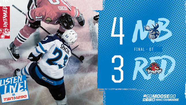 The deadlock remained in place until the 11:05 mark of the final stanza when the Moose power play checked in again. Peter Stoykewych started a slick passing play that ran through Buddy Robinson and ended with Lemieux unloading a one-timer into the Rockford net. Manitoba looked to be headed for two points until Luke Johnson was able to walk in and squeeze a shot past Comrie to tie the game with 1:58 left. The late goal forced overtime which started slowly with the Moose carefully maintaining control of the puck for the first 90 seconds until the three-on-three period blew wide open. After a pair of Nic Petan chances failed to connect, the IceHogs broke away down the ice for an opportunity of their own. Comrie came up with the game-saving stop and Sami Niku turned the puck up-ice to Petan who cruised in on a breakaway and picked his spot to send the Moose to a 4-3 victory.