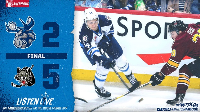 The Manitoba Moose (20-20-3-2) came up short in a 5-2 loss to the Chicago Wolves (25-15-5-1) at Allstate Arena Saturday evening. The Wolves controlled the pace of play in the first, outshooting the Moose 14-6 in the opening period. Eric Comrie held back the tide until the late stages of the frame when Tomas Hyka slipped into the offensive zone and snapped a shot by the Moose goaltender with 3:34 left in the period. The Moose got back on even footing under two minutes later as Marko Dano tucked in a rebound off the back-wall for a power play goal. Daniel Carr restored the Chicago lead 48 seconds later, finding a loose puck in front and pushing it to the back of the net as the Wolves took a 2-1 lead to the break.