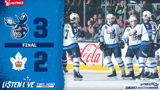 The Manitoba Moose (26-25-3-2) got a late goal to top the Toronto Marlies (29-19-6-3) by a 3-2 score Wednesday afternoon at Coca-Cola Coliseum. The Moose opened the scoring seven minutes into the first when Seth Griffith picked the far corner on Michael Hutchinson for a power play tally. Manitoba made it 2-0 at 10:46 as Marko Dano created a turnover on the forecheck, then had his centering feed redirect into the net off a defender. Toronto got one back with 5:46 to go in the period courtesy of a Dmytro Timashov wrister that beat a screened Eric Comrie. The Moose outshot the Marlies 14-8 as they took a 2-1 lead to the first intermission.