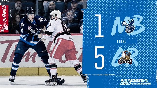 Grand Rapids opened the third period by upping the lead to three. Holmstrom potted his second of the game, banking the puck into the net from below the goal line. A late comeback wouldn’t be in the cards for the Moose on this night. Dylan McIlrath added another goal to Grand Rapids’ total with 1:48 remaining as the Griffins took a 5-1 victory.