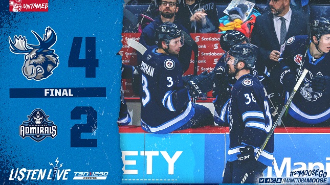 The Manitoba Moose (17-18-2-1) scored four straight goals as they won 4-2 over the Milwaukee Admirals (19-15-6-1) Wednesday evening at Bell MTS Place. Milwaukee opened the scoring 10:27 into the contest with Nicholas Baptiste taking advantage of the game's first power play. The Moose tied the contest 1:29 later when Skyler McKenzie got the puck to Kristian Reichel in front of the net, and the rookie forward put a quick shot in off the post. Just 1:27 later, Seth Griffith moved the puck toward the point for Logan Stanley, who walked into a one-timer that blew by Troy Grosenick to give the Moose a 2-1 lead. That score held to the break, with the Moose carrying 1:25 of power play time into the second period.