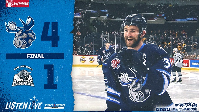 The Manitoba Moose (18-18-2-1) pushed back to the .500 mark with a 4-1 victory over the San Antonio Rampage (21-19-1-0) at Bell MTS Place on Saturday afternoon. The Moose didn't waste any time, opening the scoring just 10 seconds into the game. Jansen Harkins dug the puck off the wall and put a cross-ice pass to Logan Shaw who snapped a shot past Jared Coreau. Despite the quick offensive start, Shaw's tally would be the only goal scored in the period. Manitoba only allowed three shots in the frame, all stopped by Eric Comrie, while Coreau turned away the next eight Moose attempts for a 1-0 score after 20 minutes.