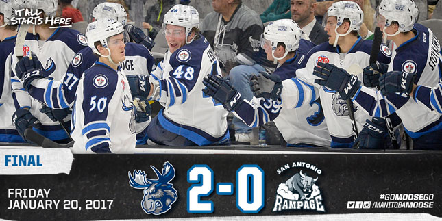 The Manitoba Moose (16-18-3-2) continued their six-game road swing with the first game of a back-to-back set against the San Antonio Rampage (16-20-4-0) on Friday night. The Moose held the early edge in shots as the visitors pumped 17 attempts at Jeremy Smith in the San Antonio net. The Rampage netminder knocked away all 17 to help San Antonio to a scoreless tie with the Moose after 20 minutes. Kyle Connor had the best Manitoba chance, slipping in behind the defence and beating Smith, but sliding the puck off the goal post. Eric Comrie made seven stops for the Moose in the period.