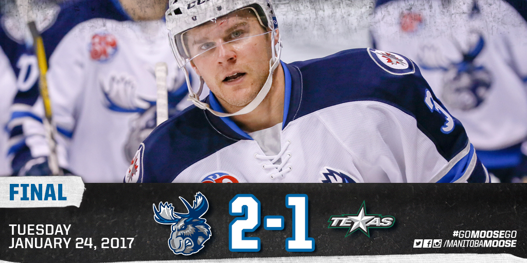 The Manitoba Moose entered Tuesday night’s game looking for revenge after falling 4-3 at the H-E-B Center versus Texas last Wednesday (Jan. 18). Tonight’s contest was off to a competitive start with both teams playing physically and gathering their fair share of offensive chances. Manitoba’s hot penalty kill went to work once again in the first period, snuffing an early Texas powerplay. Later in the period the Moose took to the powerplay and scored the game’s first goal as Dan DeSalvo swatted home his 11th goal of the season after a net-front scramble at 15:23. Kyle Connor and former Texas Star, Scott Glennie, had the assists.