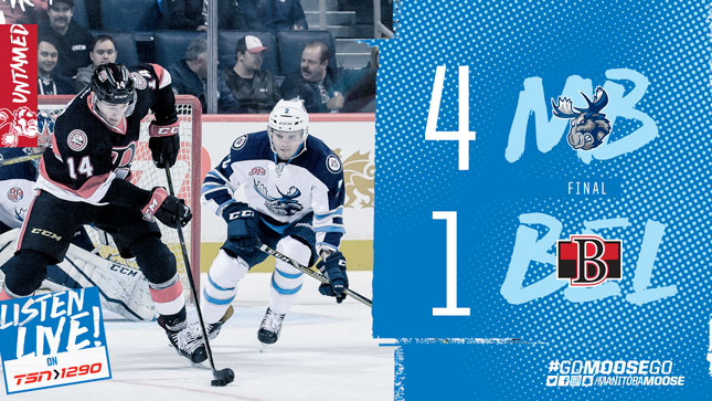 The Manitoba Moose (27-10-3-2) began a stretch of nine straight games away from Bell MTS Place on Wednesday night, at Yardmen Arena, against the Belleville Senators (18-23-0-3). A fast start led to a dominant first frame for the Moose. Darren Kramer started off the scoring just over five minutes in, winning a puck battle and snapping home his first of the season. The fourth line of Kramer, Garrett Meurs, and Elgin Pearce caused a lot of problems for Belleville in period one. Meurs had several high-quality chances, including hitting a post before drawing an interference penalty. That power play only lasted four seconds when Michael Spacek scored his seventh of the season off Patrice Cormier's face-off win. Less than five minutes later, Nic Petan set a new career-high in points (33) when he turned a Belleville turnover into goal number three for the Moose. The puck took several strange bounces before finding it's way past Danny Taylor and into the net.