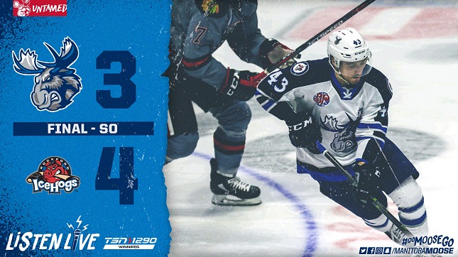 The Moose looked to be headed to their 20th victory of the season, but Rockford started a comeback with two minutes left. Dylan Sikura's long shot found the back of the net to get the home side within one. A minute after Logan Shaw's long clearing attempt hit the post instead of the empty net, the IceHogs pulled even. A faceoff win for Rockford quickly found its way to Jordan Schroeder for a one-timer to tie the game 3-3 with three seconds remaining. The Moose nearly walked away as overtime winners, but Niku's one-timer in the extra frame was turned away by Lankinen. The IceHogs scored on both of their attempts in the shootout, while the Moose came up empty in the extra shots to fall 4-3.