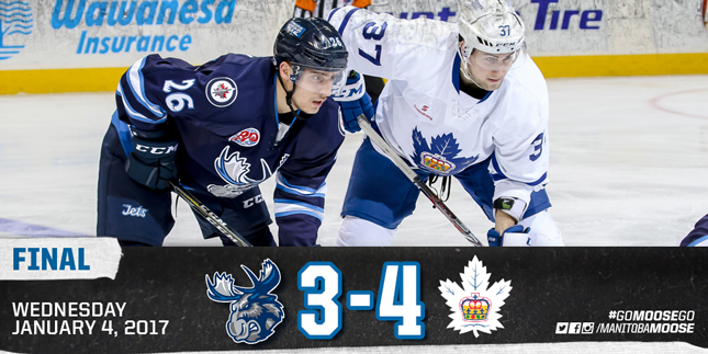 Toronto grabbed the lead five minutes into the third when Tobias Lindberg tipped an Andrew Campbell point shot to the back of the net. The visitors took advantage of a powerplay three minutes later and another redirect, this time from Kerby Rychel, to build a 4-2 advantage. Just shy of the 10 minute mark, Scott Kosmachuk slipped a sharp angle shot past Enroth to pull the Moose within one. Manitoba called Comrie to the bench for the extra attacker in the late stages, but couldn’t manufacture a tying goal as the Marlies came away with a 4-3 win.