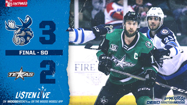 The teams traded chances in overtime, but both Appleby and Bow turned all of them away. In the shootout, Appleby stopped four out of five Texas shooters while Logan Shaw and Jansen Harkins scored to give the Moose the 3-2 win.