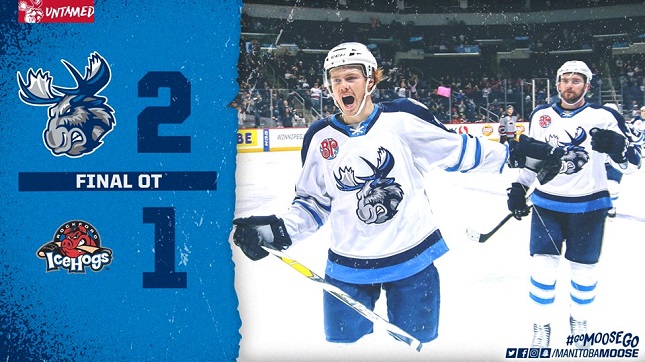 Rockford maintained its lead through the final frame until the Moose were finally able to break through on a power play. With the IceHogs in the box for high-sticking, Manitoba only needed seven seconds on the man advantage for Seth Griffith to set up a Mason Appleton one-timer to tie the game with 7:13 to go in regulation. Neither team found a way to break the deadlock, and off to overtime they went. The extra frame lasted 51 seconds, with the Moose controlling the puck nearly the entire time. An Appleton shot bounced high in the air and found the stick of Michael Spacek, who was able to get Lankinen to bite on a fake before going upstairs for the winner. Manitoba's win moved the club within one point of the IceHogs in the Central Division standings.
