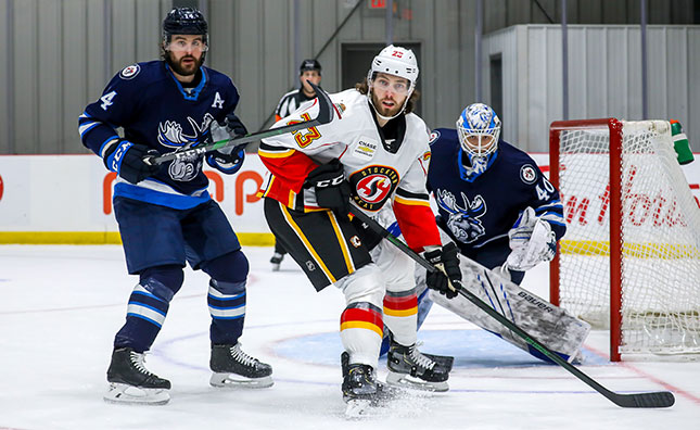 The Manitoba Moose (6-7-2-0) dropped a 2-1 contest against the Stockton Heat (8-2-0-0) on Thursday night at Bell MTS Iceplex. With 6:56 remaining in the first period, Giorgio Estephan rushed into the Moose zone and was trapped by Mantioba’s defencemen. Meanwhile, Luke Philp swooped in, collected the loose puck, and made no mistake on his target to gain a 1-0 lead for Stockton. Manitoba outshot the Heat by a 8-6 count during the first period.