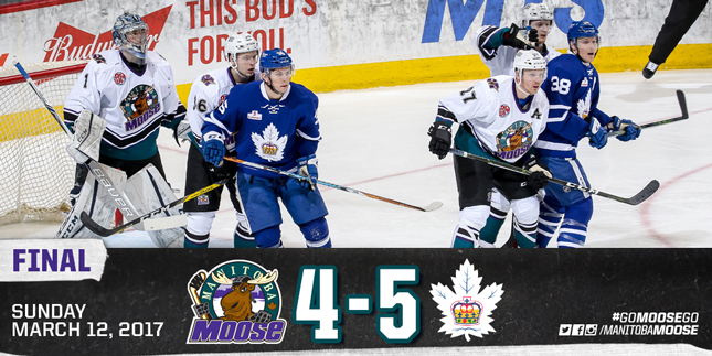 Toronto pulled back in front seven minutes into the third off the stick of defenceman William Wrenn. Continuing the trend of fast responses, the Moose tied it up 3:08 later. Jimmy Lodge sent Ryan Olsen a step ahead of the defence and Olsen cut across the crease on a nice backhand finish to tie the game 4-4. The back-and-forth continued when Kerby Rychel was able to strike for the Marlies on the powerplay with 7:35 left in the third. The Moose came within inches of tying the contest late, but Brenden Kichton’s shot went bar down and out with 1:15 remaining. The hosts couldn’t find a way to tie the game as Toronto came away with the 5-4 win.