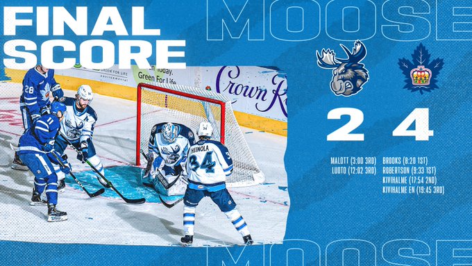 The Manitoba Moose (4-5-0-0) lost a 4-2 contest against the Toronto Marlies (5-4-0-0) on Monday night at Coca-Cola Coliseum in Toronto, Ont. With 8:20 gone in the first period, Adam Brooks cashed in on a rebound and gave the Marlies the one-goal lead. Just over a minute later, Nick Robertson capitalized on a Toronto power play opportunity and pushed the Marlies lead to 2-0.