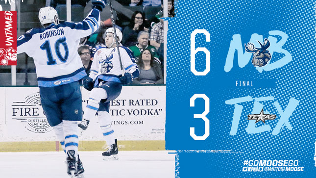 The Manitoba Moose (37-17-4-4) and Texas Stars (32-22-6-3) got off to a blistering start with a five-goal first period. Texas opened the scoring 2:50 into the game on a back door tap in from Curtis McKenzie on the power play. The Moose defence responded with the next three goals of the game. Jan Kostalek got the Moose even at 7:48 when he whipped the puck from the line and found the back of the net. Kirill Gotovets gave Manitoba the lead 30 seconds later when he pounced on a loose puck for his first of the season. The Moose made it a two-goal game off the stick of Peter Stoykewych, who accepted a pass from JC Lipon in the circle before firing the puck home at 12:39. The Stars got back within one on McKenzie's second power play tally at 16:21 to send the game to the break with the Moose in front 3-2.