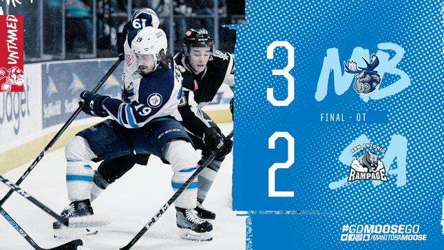 The defensive battle carried over into the final frame as offence continued to be at a premium. San Antonio regained the lead 7:09 into the period on an Andrew Agozzino wraparound. The Manitoba offence waited until last call to come up with a tying marker. With Jamie Phillips on the bench, Cormier worked the puck free to Mason Appleton who rifled home the tying goal with 67 seconds left on the clock. Overtime only needed one shot and 54 seconds to decide a winner. Nic Petan accepted the puck from Cameron Schilling in his own end before heading down the ice, and knifing through three Rampage defenders to bury the winner and lift the Moose to a 3-2 victory.