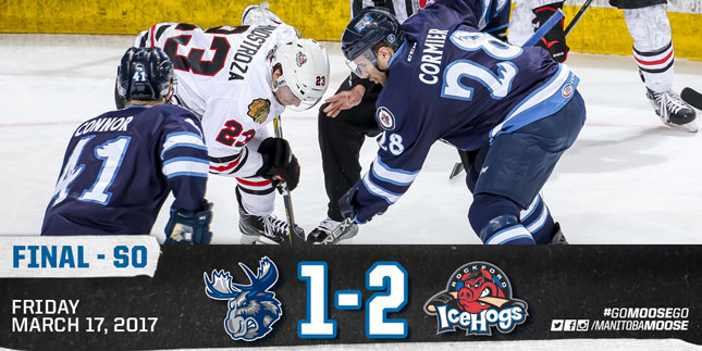 Rockford didn’t take long to open the scoring when the teams got back on the ice for the third. Kyle Baun deposited the puck into a wide open net after Tyler Motte rang a shot off the post. The Moose wouldn’t be held off the scoresheet on the evening as Chase De Leo brought the game to a 1-1 draw in with 8:46 to go. De Leo pounced on a loose puck in the slot and wired home the tying goal. The game rolled over into overtime where the Moose outshot Rockford 5-1, but couldn’t beat Glass. The Rockford goalie remained sharp in the shootout, turning away all three Moose. Playing in his first AHL game, Anthony Louis scored the shootout winner to give Rockford the extra point in the 2-1 game.