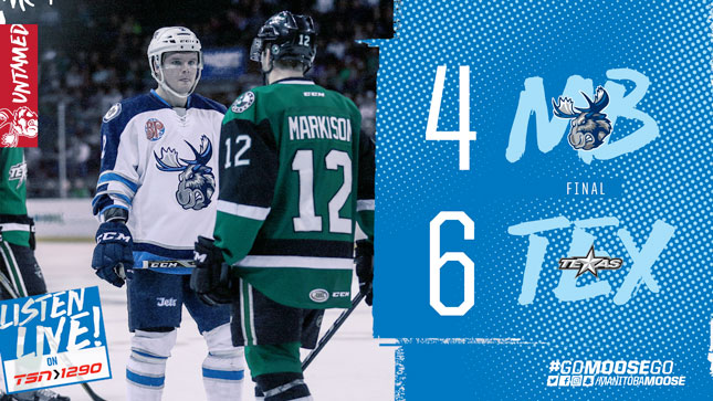 Texas scored early again in the third, when a rebound off a Gavin Bayreuther shot bounced right to the stick of Denis Gurianov, who pushed the lead back to three. Texas built on that lead on the power play when Curtis McKenzie cleaned up a rebound for his sixth goal of the season against Manitoba. The Moose didn't quit, though, and Chase De Leo fed a pass through centre to send JC Lipon in alone. Lipon whipped a shot top corner on McKenna. Just over one minute later, Mason Appleton found Sami Niku at the point. Niku hammered home his 13th of the season. That was as close as Manitoba would get, though and Texas held on for the 6-4 victory.