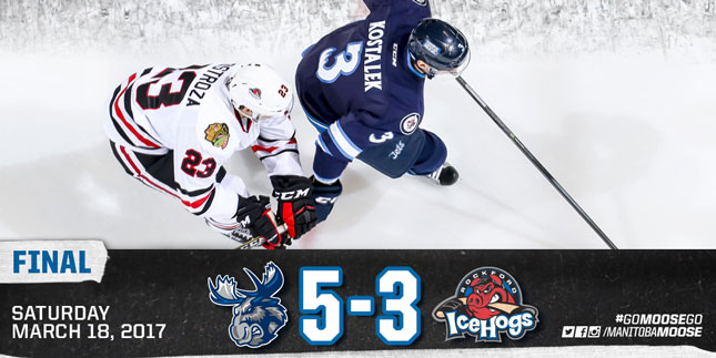 The Manitoba Moose (24-32-4-5) brought their season series against the Rockford IceHogs (22-31-9-3) to a close at MTS Centre on Saturday night. Ryan Olsen broke the ice 13:43 into the contest. Olsen created a turnover below the goal-line before beating Jeff Glass back to the near post for his sixth goal of the season. The goal left Manitoba with a 1-0 lead after the first.