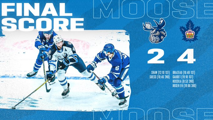 The Manitoba Moose (4-6-0-0) were on the losing end of a 4-2 final against the Toronto Marlies (6-4-0-0) on Wednesday night at Coca-Cola Coliseum. With 7:50 remaining in the first period, Nathan Todd’s rebound deflected towards Hayden Shaw and he snapped a shot past Toronto’s netminder Andrew D’Agostini giving the Moose the 1-0 lead. On a Marlies man-advantage with 3:12 to go in the period, Justin Brazeau cashed in on a loose puck in front of Moose goaltender Mikhail Berdin and evened the score to a 1-1 count. With under a minute remaining in the frame, Tyler Gaudet slipped the puck five-hole on a drive to the net and gave Toronto the 2-1 advantage.