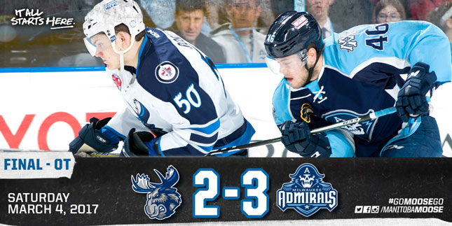 The Moose extended their lead 6:07 into the third as Connor nabbed his second of the night, and ninth in his last five games, tipping a Brian Strait point shot past Marek Mazanec. The Admirals stormed back after the mid-point of the period. Matt White prevented a Moose clearing attempt on an Admirals powerplay, walked in and cut the lead to 2-1. Just 1:32 later, Miikka Salomaki snuck in on a breakaway and used a backhand move to tie the game 2-2. The teams remained even through regulation. It only took Mike Ribeiro eight seconds to end the game in overtime, completing the comeback win for Milwaukee by the 3-2 score.