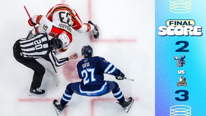 The teams were locked in a defensive battle in the opening period. The Griffins had the best chance of the first frame, when Sheldon Dries was foiled in tight by Kaapo Kähkönen. The Moose netminder made eight saves in the period, matched by Sebastian Cossa’s eight stops for the Griffins.