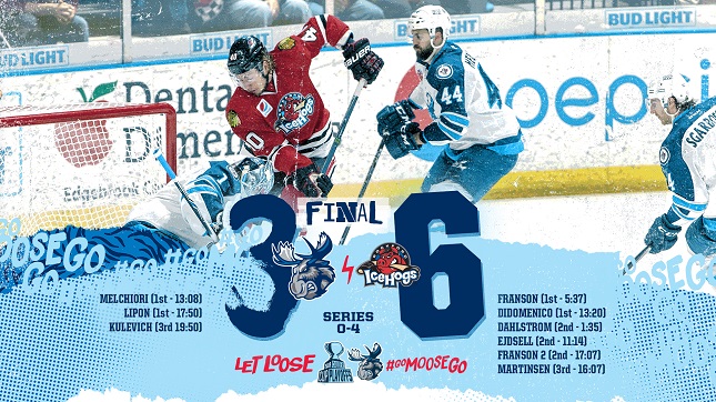 The Manitoba Moose (3-6) and Rockford IceHogs (7-0) met in Game 4 of the Central Division Finals with Manitoba facing a sweep in Rockford. The hosts opened the scoring 5:37 into the game on power play rocket from Cody Franson. The Moose pulled even with 6:51 remaining in the period when Julian Melchiori snuck a shot through from the point for his second goal in as many games. The tie lasted just 31 seconds as Chris DiDomenico put Rockford back in front, calling his own number on a three-on-two rush. A clash between the teams behind the IceHogs net with 3:17 left in the period resulted in a major penalty being assessed to Patrice Cormier. The numbers game didn't go in favour of the IceHogs as JC Lipon stole the puck, raced in on a breakaway and slipped a backhander past Collin Delia with 2:10 to go in the period. The penalty killers held until the intermission to keep the game tied 2-2.