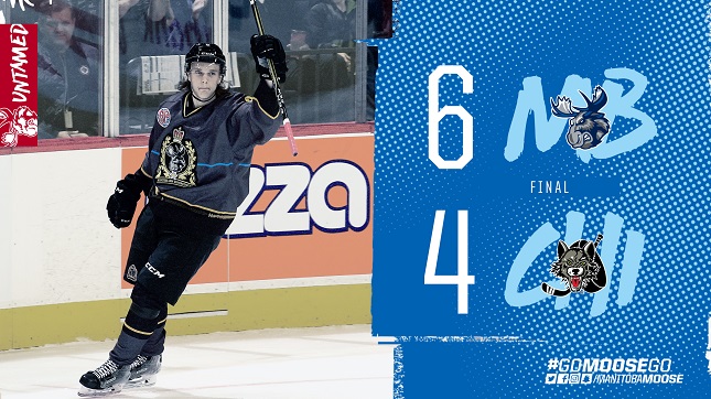 Chicago got even again 8:33 into the second on Stefan Matteau’s third goal in two games against the Moose. Manitoba regained the lead when Peter Stoykewych put a perfect saucer pass onto the tape of Jack Roslovic who wired a shot to the top shelf 12:58 into the period. The one goal lead held as the Moose carried a 4-3 advantage into the third.