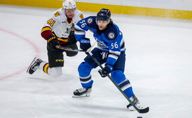 The Moose nearly grabbed the lead in the opening minutes of the third when Walker Duehr hit the post, and Miftakhov robbed Nikita Chibrikov in tight. Chicago broke the deadlock moments later as Nadeau got his second of the game with a deflection to make it 2-1. Felix Unger Sorum added a late tally of his own for some insurance, before Nikita Pavlychev iced a 4-1 victory for the Wolves with an empty-netter. Miftakhov made 23 saves in the win, while DiVincentiis turned away 26 shots.