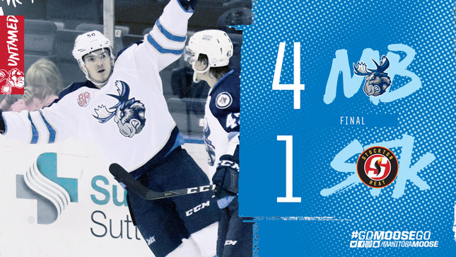 The third period opened with the Moose weathering an early flurry of chances from the Heat, but once the visitors emerged, they went on the attack. After applying furious pressure, but being turned away by Jon Gillies, Manitoba finally broke through 10:44 into the period. Jack Roslovic stole the puck, and sniped from the slot to give the Moose their first lead. Just 42 seconds later, Mike Sgarbossa created another turnover and tucked a shot up high for a 3-1 Manitoba advantage. The Heat nearly pulled back within one, but Comrie came up with a miraculous stop on an Emile Poirier wraparound try. With time ticking down, Nic Petan scored into an empty net to seal the 4-1 Moose win.