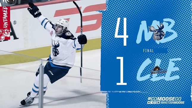 The power play continued to groove early in the period. Brendan Lemieux posted up in front of the net and cleaned up the rebound after a Michael Spacek shot to give the Moose a 3-1 advantage. Manitoba didn’t let Cleveland close the gap, thanks in part to 14 third period saves by Comrie. With time winding down, Lemieux was awarded an empty net goal to put the game away by a 4-1 score.