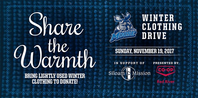 Winnipeg, MB – The Manitoba Moose Hockey Club announced today the team will host its third annual “Share the Warmth” winter clothing drive, presented by Red River Co-op in support of Siloam Mission. The campaign begins Friday, Nov. 10 and runs through Thursday, Nov. 30.