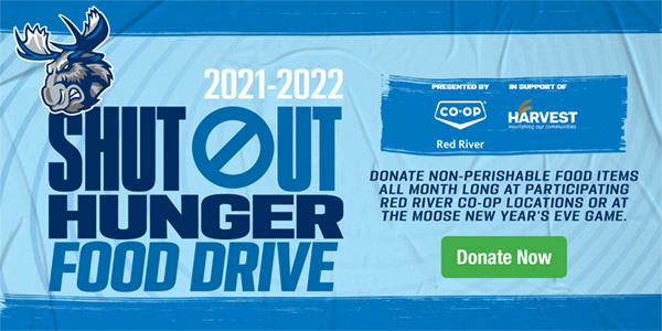 The food drive culminates with the Moose New Years Eve game on Friday, Dec. 31 (4 p.m.) against the Abbotsford Canucks at Canada Life Centre. Fans are encouraged to bring non-perishable food items to the game for donation. Anyone donating food items at the game will be entered to win a Moose jersey and four tickets to a future regular season game.
