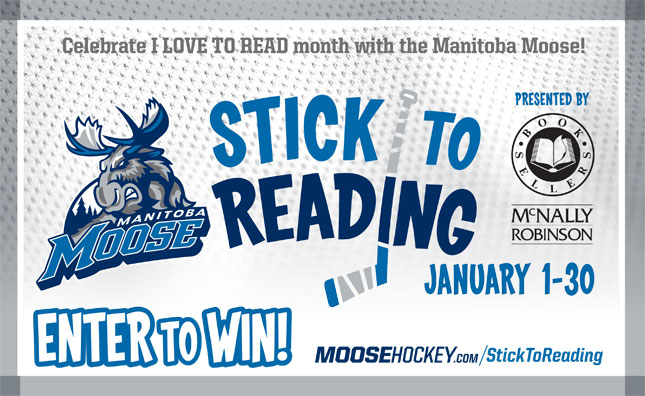 Winnipeg, MB – The Manitoba Moose Hockey Club, in conjunction with I Love to Read Month, is proud to announce Stick to Reading, presented by McNally Robinson Booksellers, is back for its second year. Stick to Reading is a program designed to encourage and promote literacy to youth in our community. Students and teachers from local schools can enter for their chance to win a visit from Manitoba Moose players. During the visit, Moose players will interact with and read to students in their classroom.