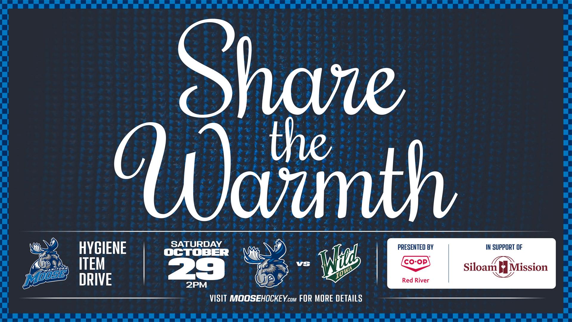 The Moose host their Share the Warmth game on Saturday, Oct. 29 (2 p.m.) against the Iowa Wild. Fans in attendance are encouraged to bring hygiene items for donation.