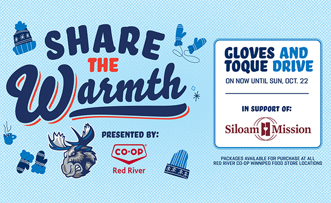 The Manitoba Moose Hockey Club announced today the launch of the team’s annual Share the Warmth campaign, presented by Red River Co-op, in support of Siloam Mission. This year’s campaign is focused on collecting donations of toques and gloves.