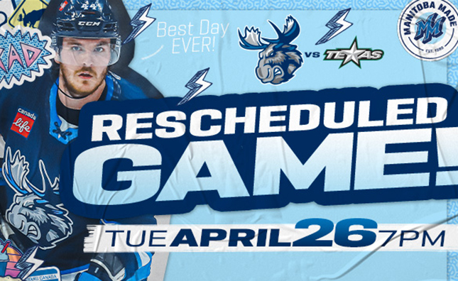 Tickets for the rescheduled game against Texas on April 26 are available at MooseHockey.com/TICKETS. Manitoba Moose Seat Holders will also receive communication to their account email regarding the rescheduled game.