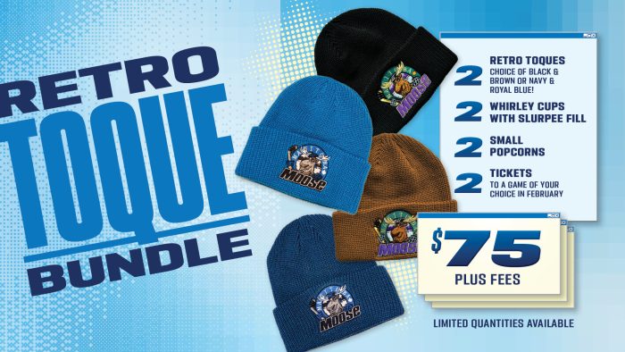 Included: Two (2) tickets to a game of your choice in February, two (2) Whirley cups with a Slurpee fill, two (2) small popcorns, and two (2) retro Moose toques – choice of black/brown combo, or navy/royal blue combo, no substitutions.